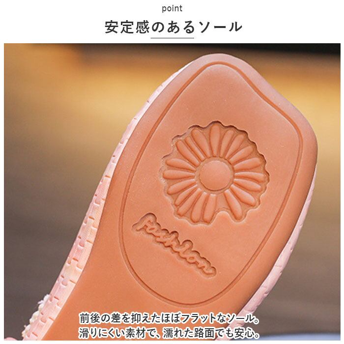 ・前後の差を抑えたほぼフラットなソール。滑りにくい素材で、濡れた路面でも安心。