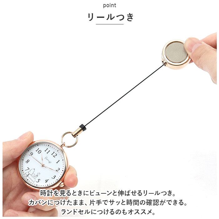 ・時計を見るときにビューンと伸ばせるリールつき。カバンにつけたまま、片手でサッと時間の確認ができる。ランドセルにつけるのもオススメ。