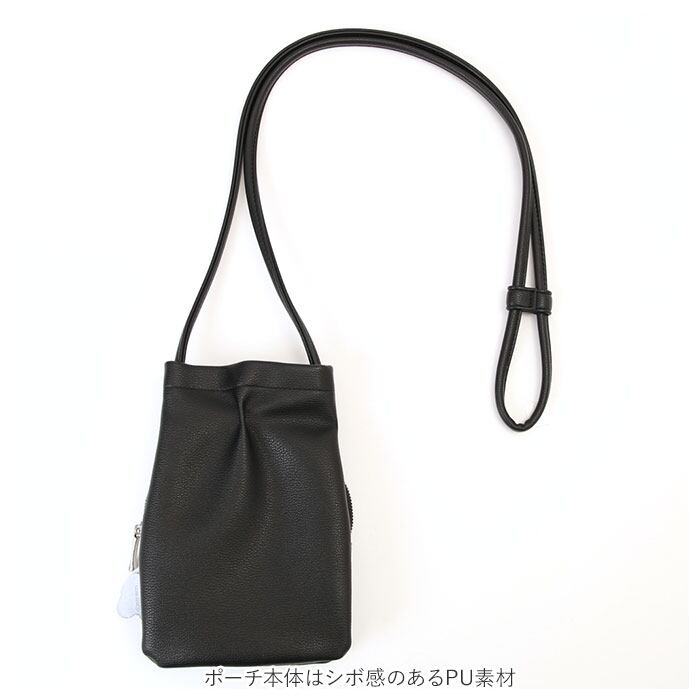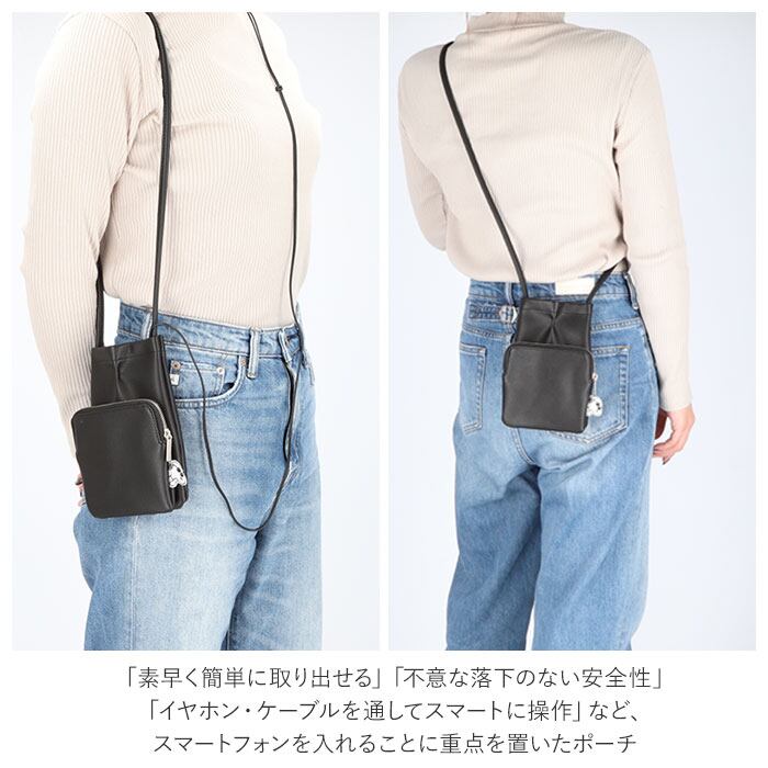 ・「素早く簡単に取り出せる」、「不意な落下のない安全性」、「イヤホン・ケーブルを通してスマートに操作」など、スマートフォンを入れることに重点を置いたポーチ。
