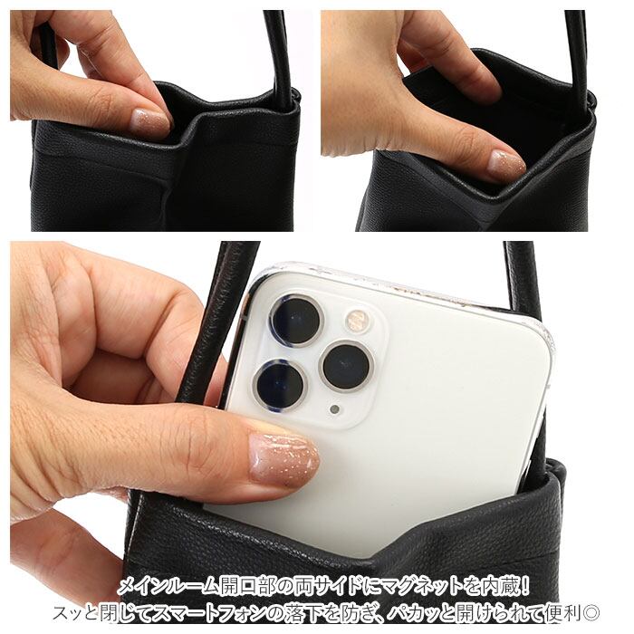・メインルーム開口部の両サイドにマグネットを内蔵!スッと閉じてスマートフォンの落下を防ぎ、パカッと開けられて便利◎