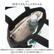 ・内側はA5サイズのノートが横向きに、500mlペットボトルが縦向きに収納OK。程よくマチを設け、すっきり収まるのが嬉しい!