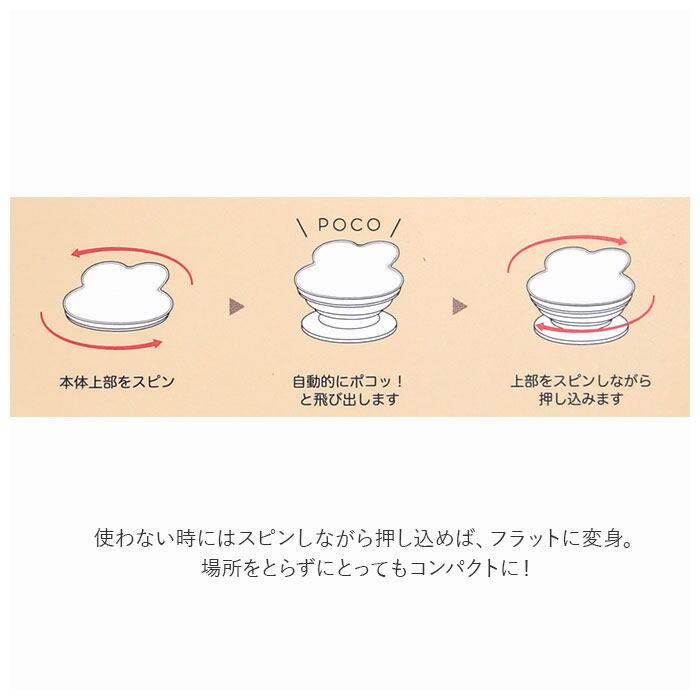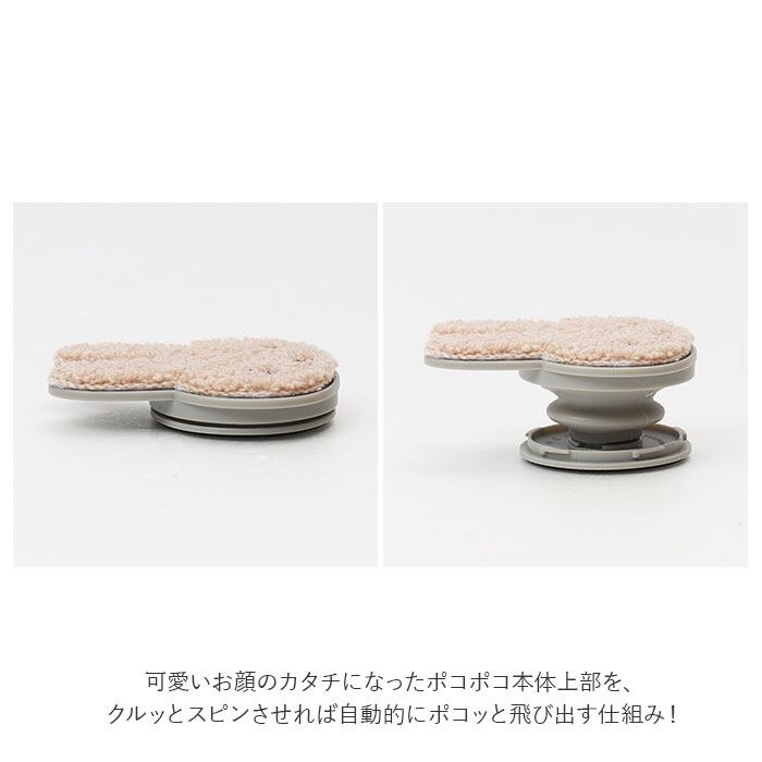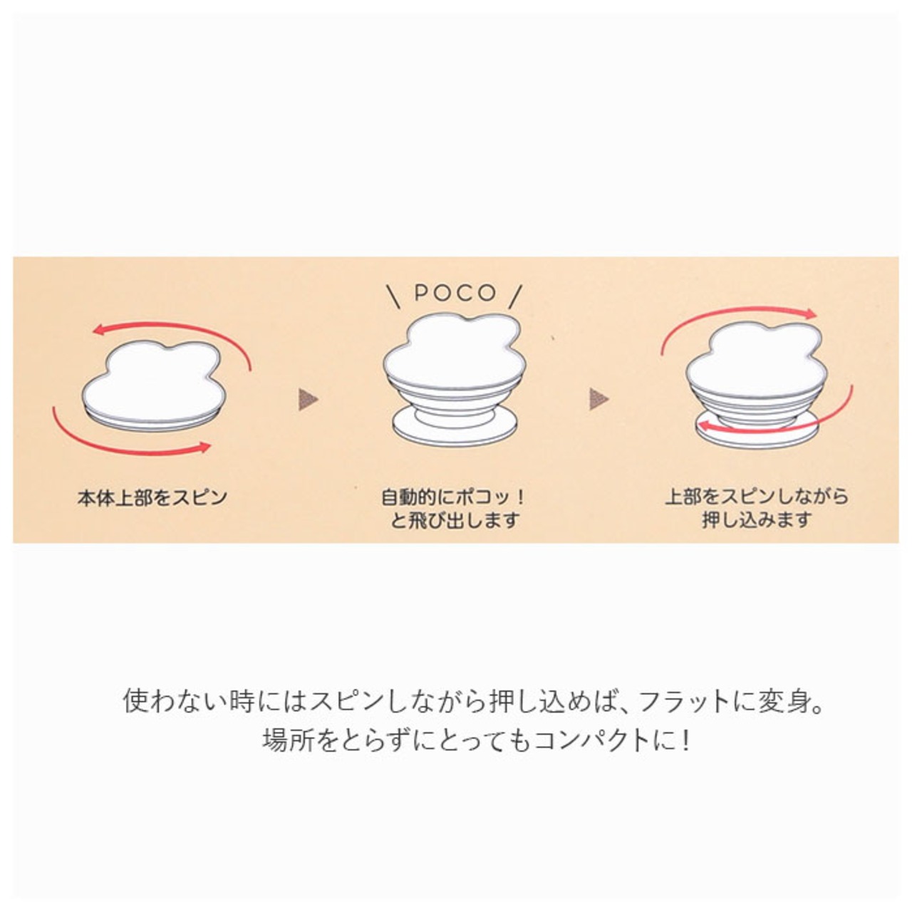・可愛いお顔のカタチになったポコポコ本体上部を、クルッとスピンさせれば自動的にポコッと飛び出す仕組み!手持ちにする時はもちろん、スマホスタンドとしても使える♪