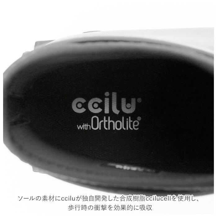 ・ソールの素材に、cciluが独自開発した合成樹脂ccilucell(チルセル)を使用し、歩行時の衝撃を効果的に吸収。