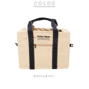 PolarBearの保冷・保温・レジカゴ・レジャーバッグです。レジカゴにすっぽり入る大容量サイズなので、食材や調味料がたっぷり入ります。ご家族でのレジャー、バーべーキューやキャンプなどのアウトドアイベントにも最適! 内部にはアルミシート加工が施されており、保冷剤用のメッシュポケット付きで、食材がいたみにくくなっています。また、使わないときにはマチ部分をサイドのボタンで折り畳み可能なので、コンパクトに収納できます。