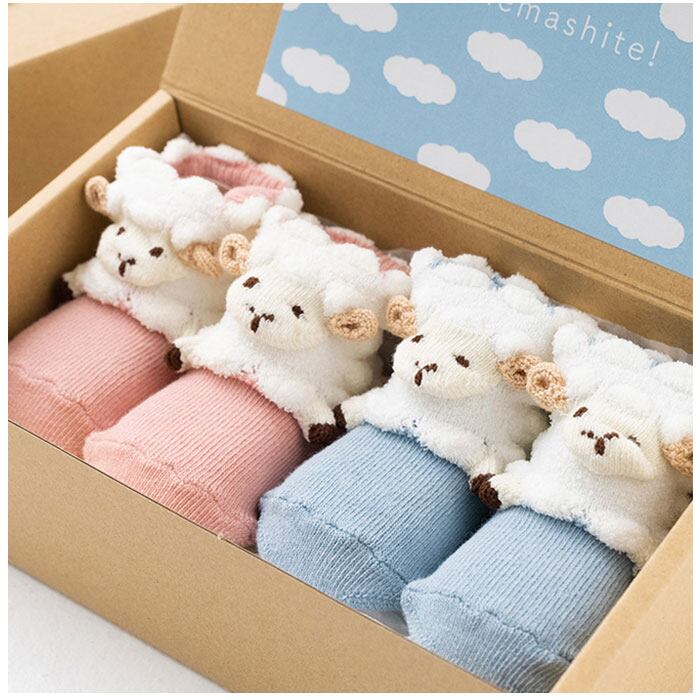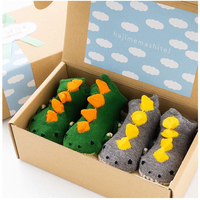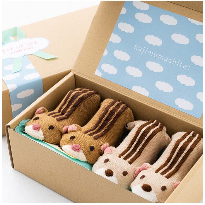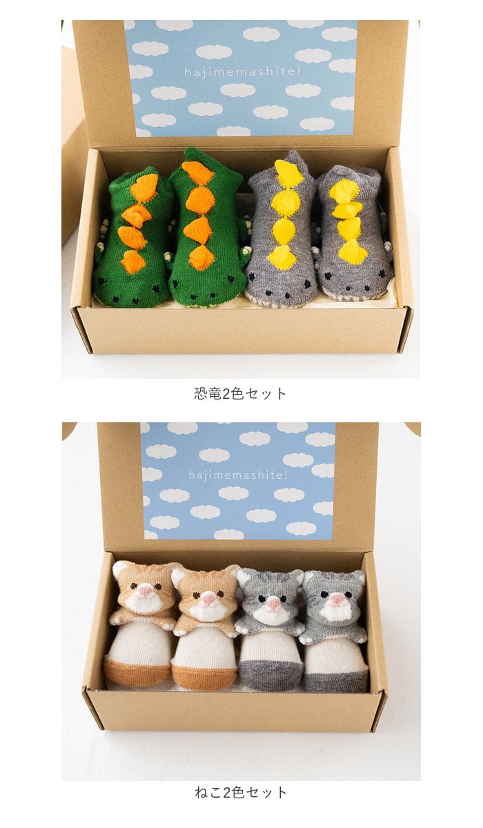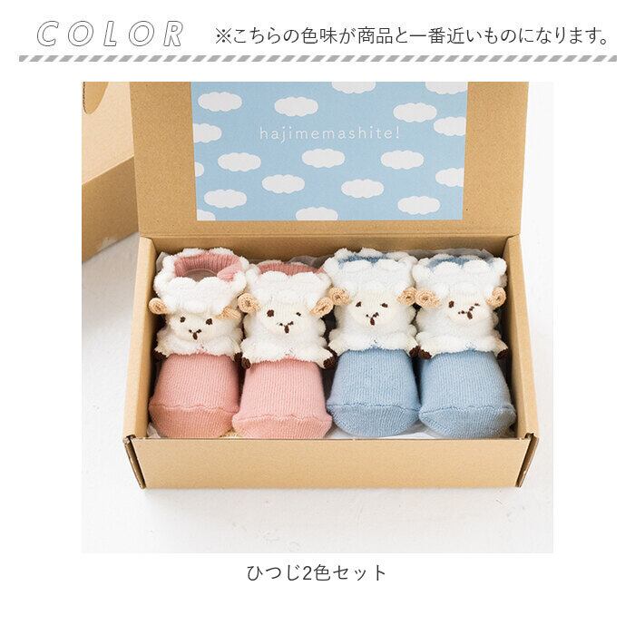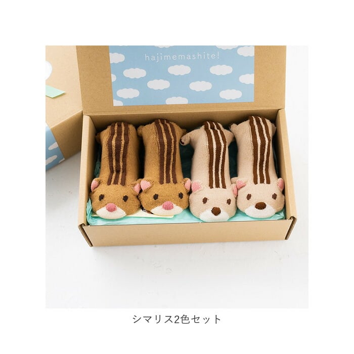 ・仲良く可愛い、色違いの2足セット。クラフトボックス入りなので、出産祝いやハーフバースデーなどの贈り物にも!