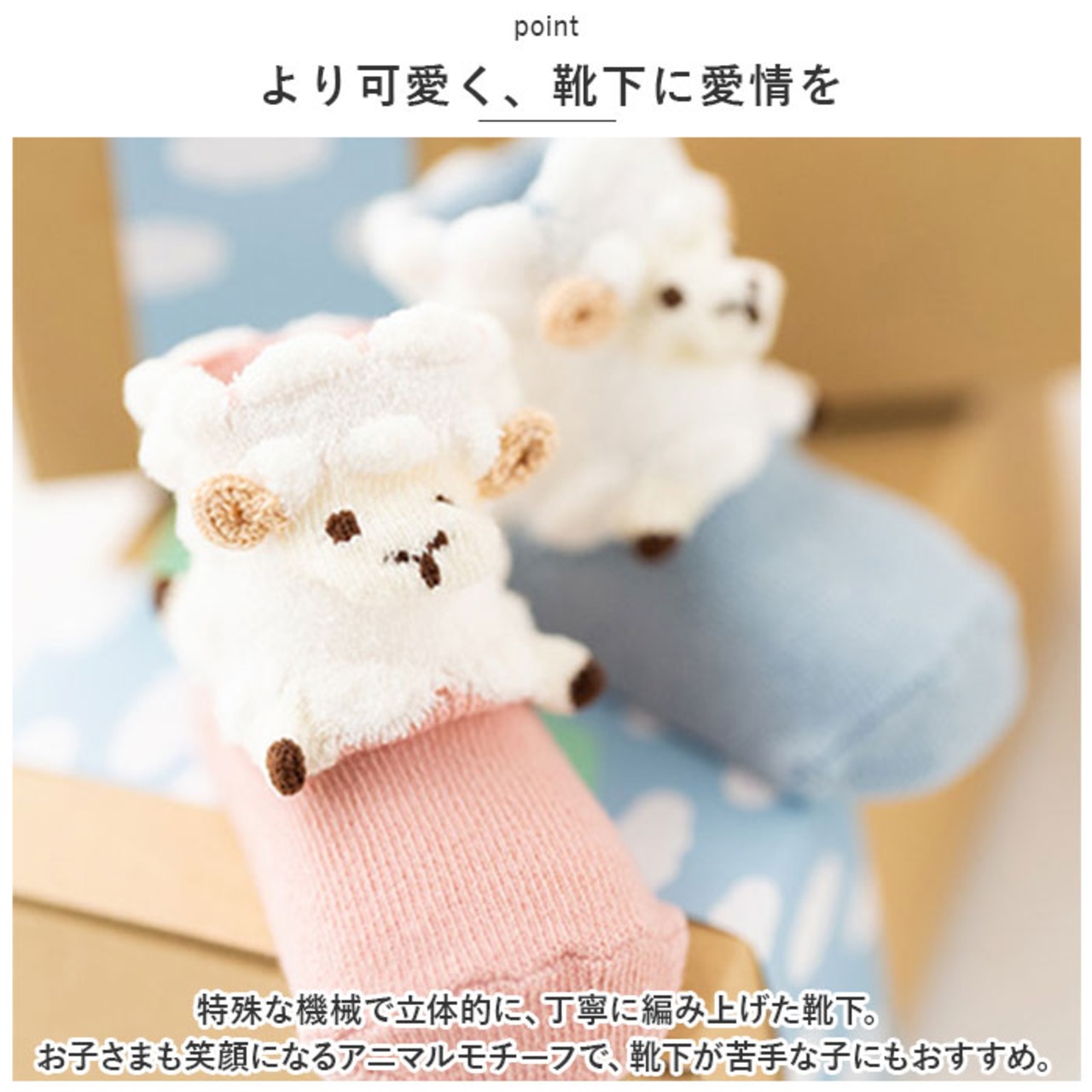 ・特殊な機械で立体的に、丁寧に編み上げた靴下。お子さまも笑顔になるアニマルモチーフで、靴下が苦手な子にもおすすめ。
