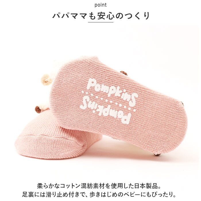・柔らかなコットン混紡素材を使用した日本製品。足裏には滑り止め付きで、歩きはじめのベビーにもぴったり。