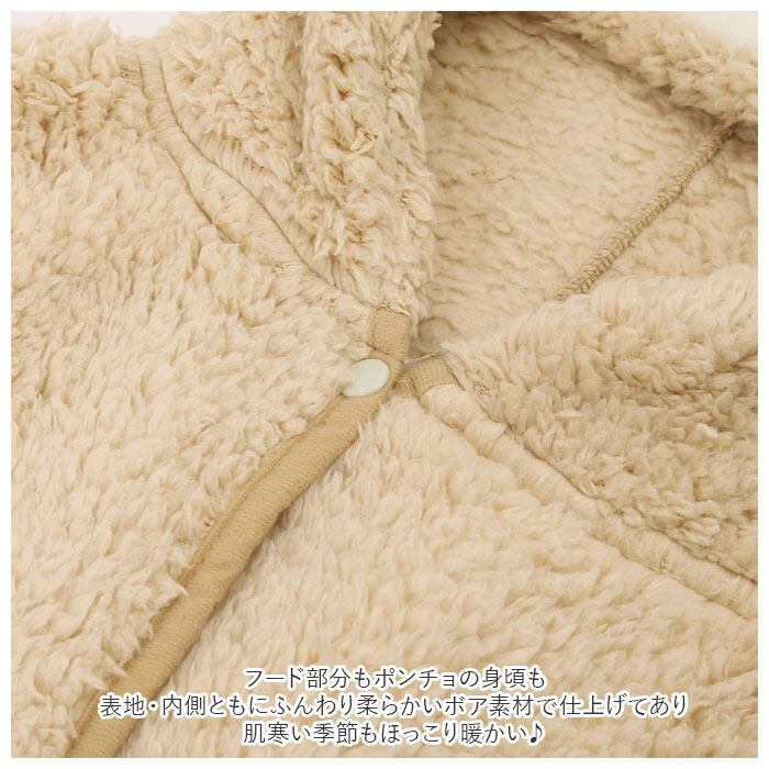 ・フード部分もポンチョの身頃も、表地・内側ともにふんわり柔らかいボア素材で仕上げてあり、肌寒い季節もほっこり暖かい♪