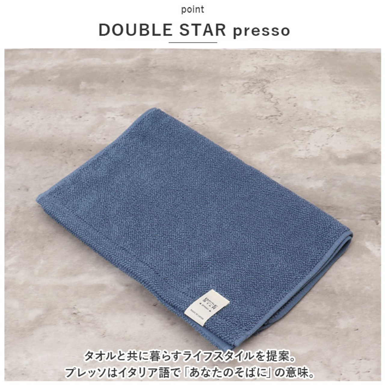 ・タオルと共に暮らすライフスタイルを提案。プレッソはイタリア語で「あなたのそばに」の意味。
