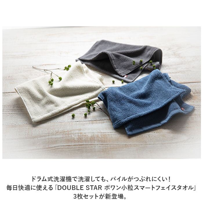 ・ドラム式洗濯機で洗濯しても、パイルがつぶれにくい!毎日快適に使える「DOUBLE STAR ポワン小粒スマートフェイスタオル」3枚セットが新登場。