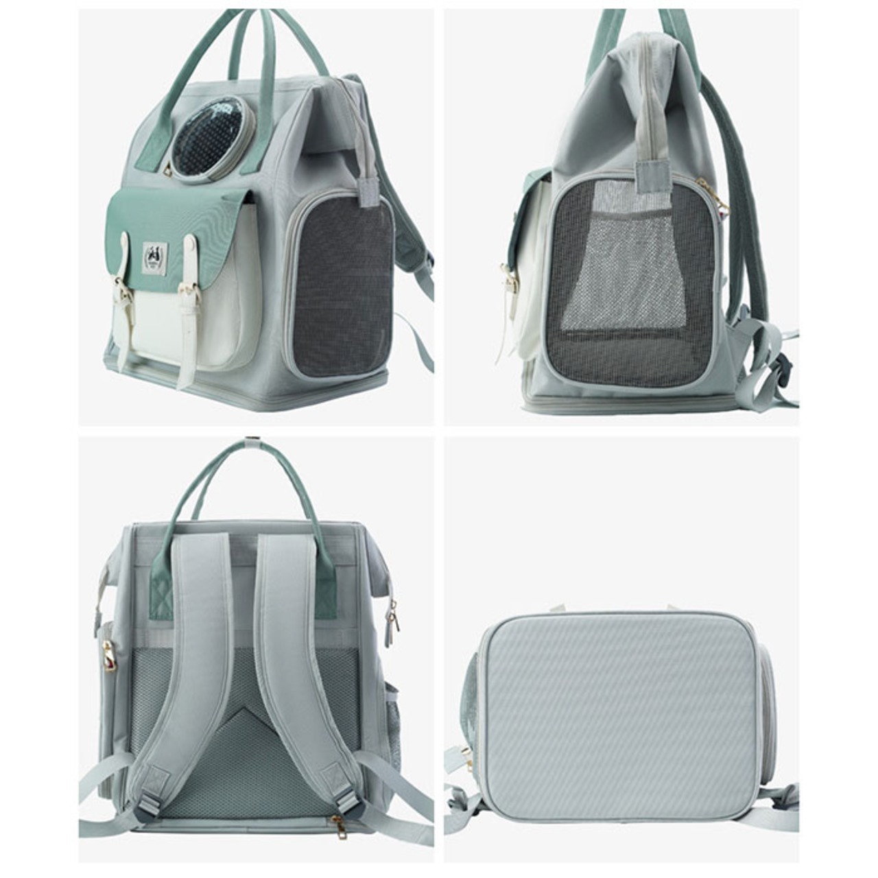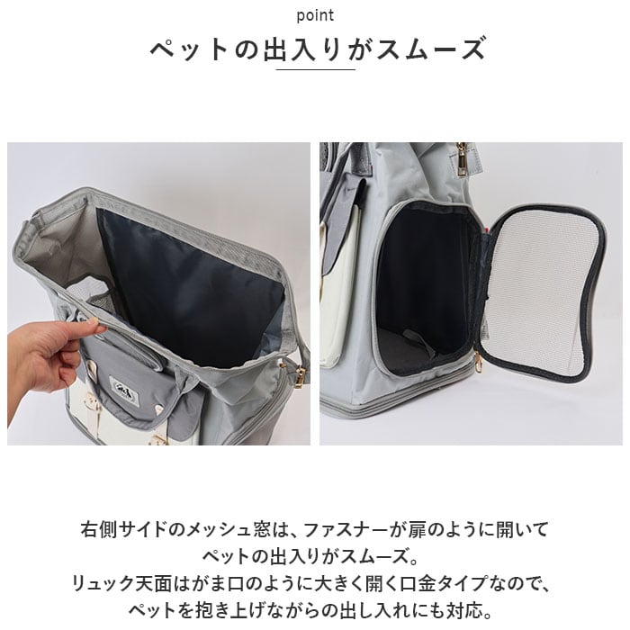 ・右側サイドのメッシュ窓は、ファスナーが扉のように開いてペットの出入りがスムーズ。リュック天面はがま口のように大きく開く口金タイプなので、ペットを抱き上げながらの出し入れにも対応。