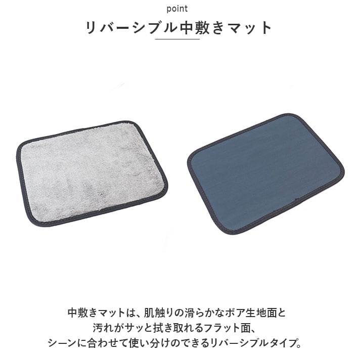 ・中敷きマットは、肌触りの滑らかなボア生地面と汚れがサッと拭き取れるフラット面、シーンに合わせて使い分けのできるリバーシブルタイプ。