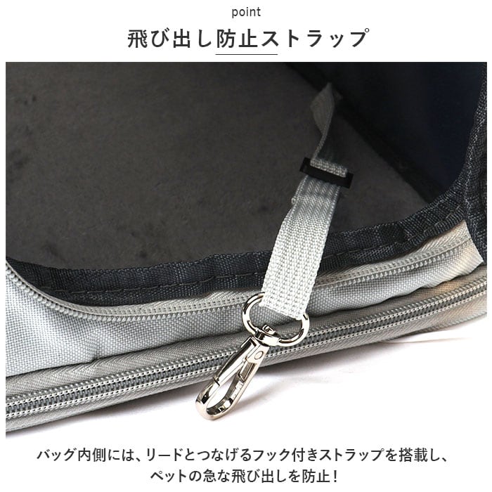 ・バッグ内側には、リードとつなげるフック付きストラップを搭載し、ペットの急な飛び出しを防止!