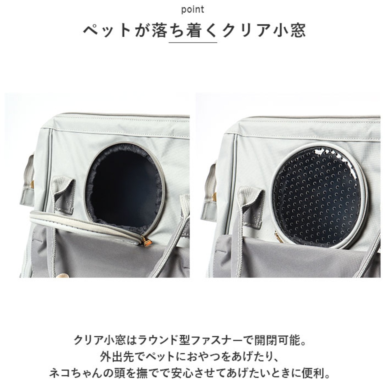・クリア小窓はラウンド型ファスナーで開閉可能。外出先でペットにおやつをあげたり、ネコちゃんの頭を撫でで安心させてあげたいときに便利。
