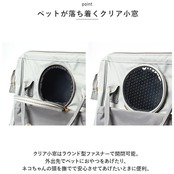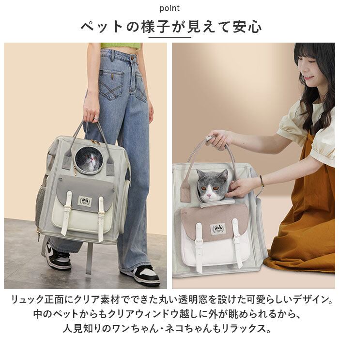 ・リュック正面にクリア素材でできた丸い透明窓を設けた可愛らしいデザイン。中のペットからもクリアウィンドウ越しに外が眺められるから、人見知りのワンちゃん・ネコちゃんもリラックス。