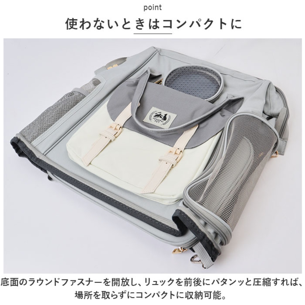 ・底面のラウンドファスナーを開放し、リュックを前後にパタンッと圧縮すれば、場所を取らずにコンパクトに収納可能。
