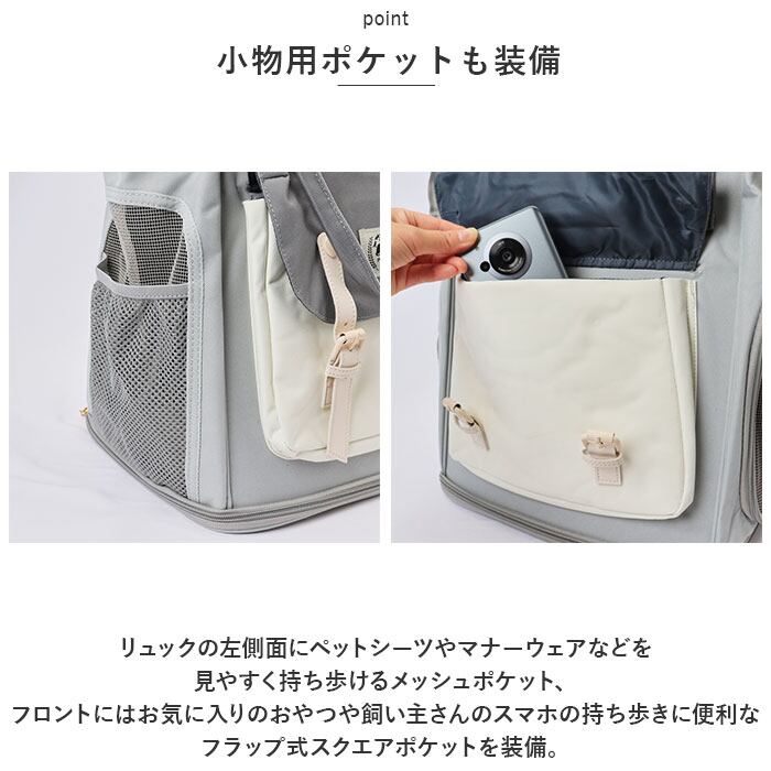 ・リュックの左側面にペットシーツやマナーウェアなどを見やすく持ち歩けるメッシュポケット、フロントにはお気に入りのおやつや飼い主さんのスマホの持ち歩きに便利なフラップ式スクエアポケットを装備。