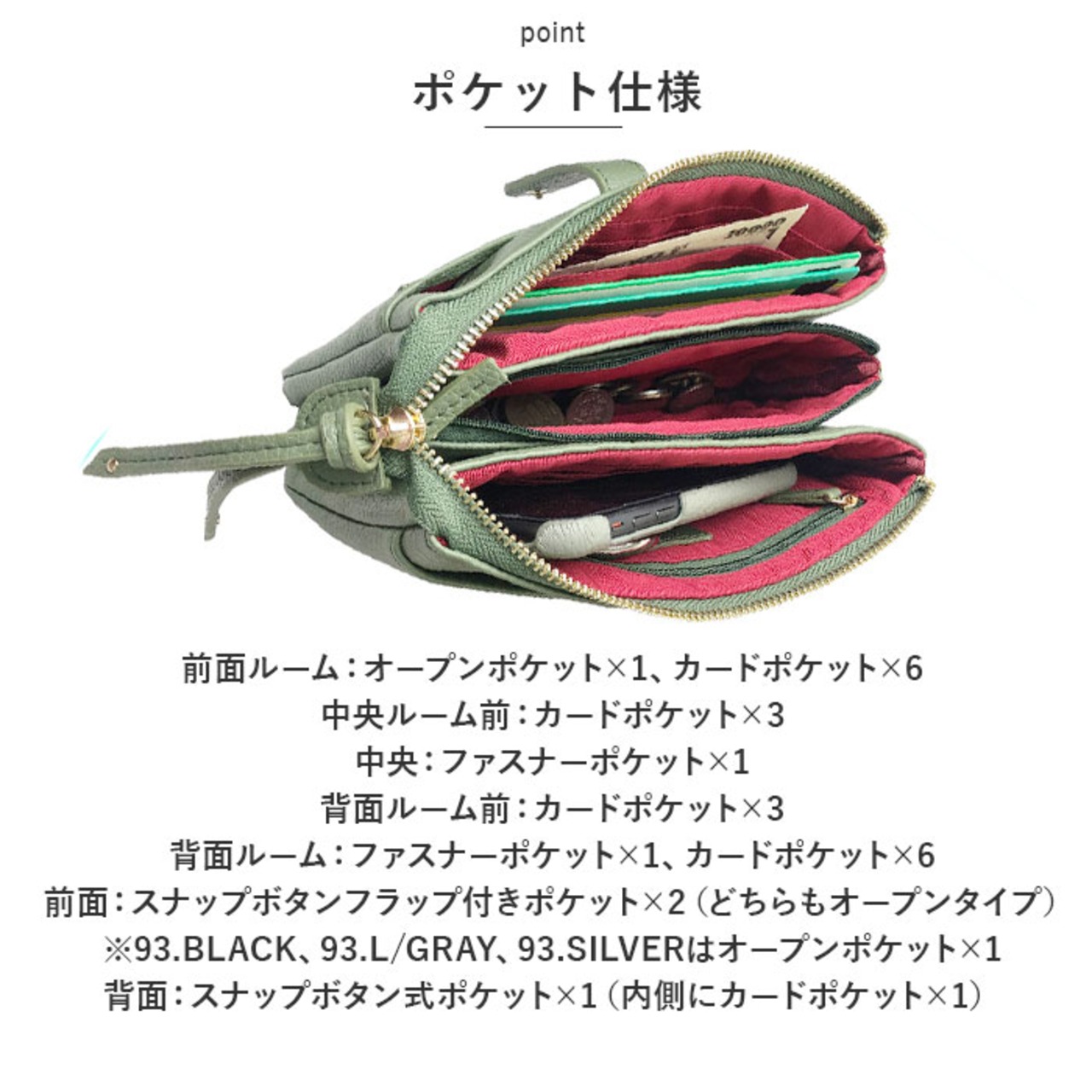・内側は3つのルームに分かれており、仕分けしやすく取り出しやすいつくり。多数のポケットを装備し、現金やカード類に加えてスマホやリップ、パスポートなども収納可能。