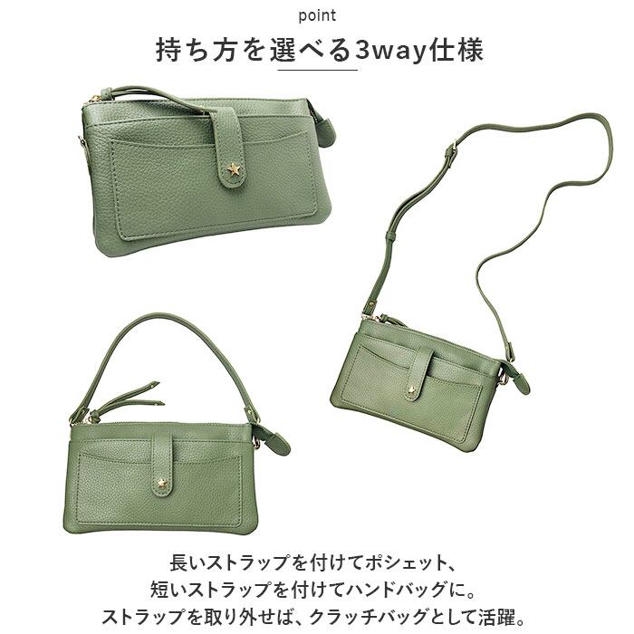 ・長いストラップを付けてポシェット、短いストラップを付けてハンドバッグに。ストラップを取り外せば、クラッチバッグとして活躍。お好みやシーンに合わせてスタイルチェンジ☆