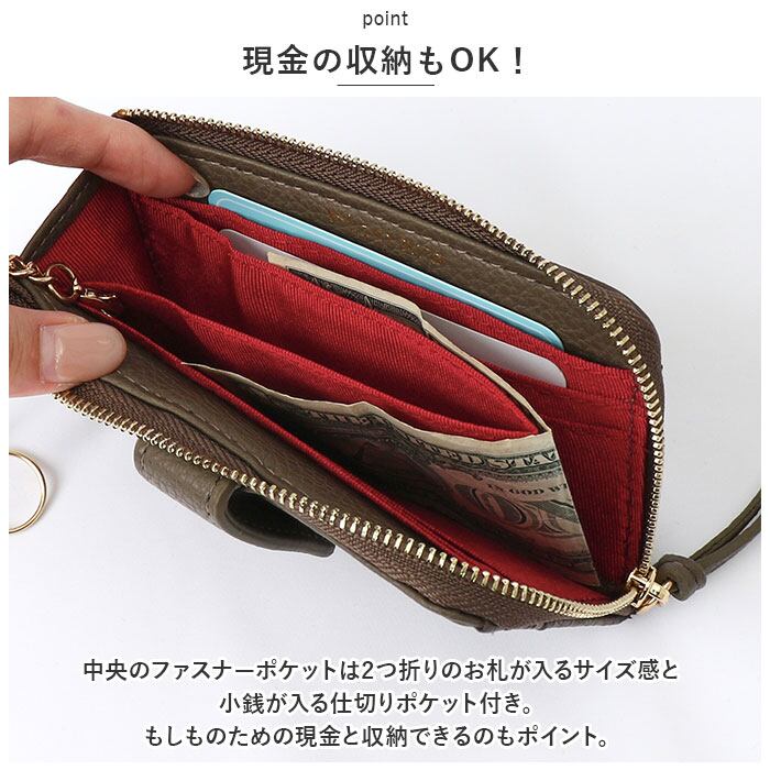 ・中央のファスナーポケットは2つ折りのお札が入るサイズ感と小銭が入る仕切りポケット付き。もしものための現金と収納できるのもポイント。
