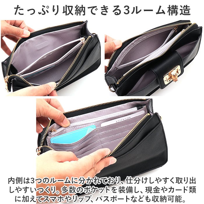 ・内側は3つのルームに分かれており、仕分けしやすく取り出しやすいつくり。多数のポケットを装備し、現金やカード類に加えてスマホやリップ、パスポートなども収納可能。
