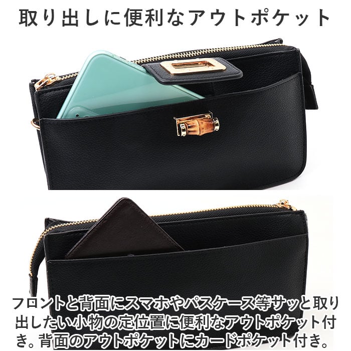 ・フロントと背面にスマホやパスケース等サッと取り出したい小物の定位置に便利なアウトポケット付き。
