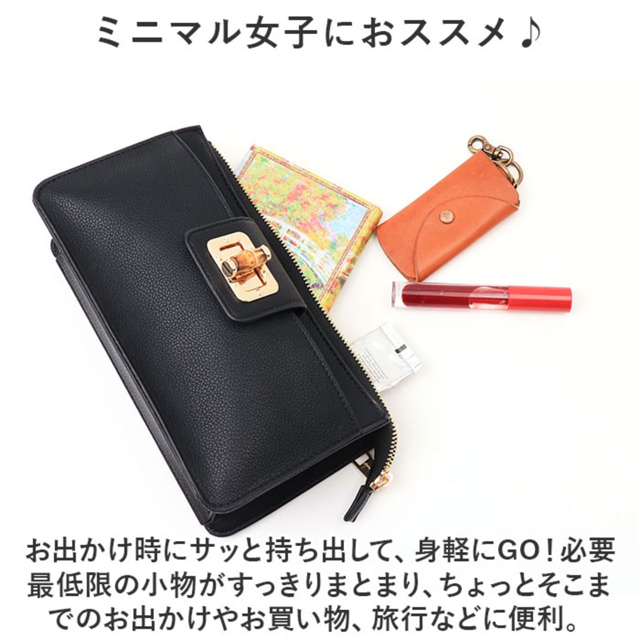 ・お出かけ時にサッと持ち出して、身軽にGO!必要最低限の小物がすっきりまとまり、ちょっとそこまでのお出かけやお買い物、旅行などに便利。