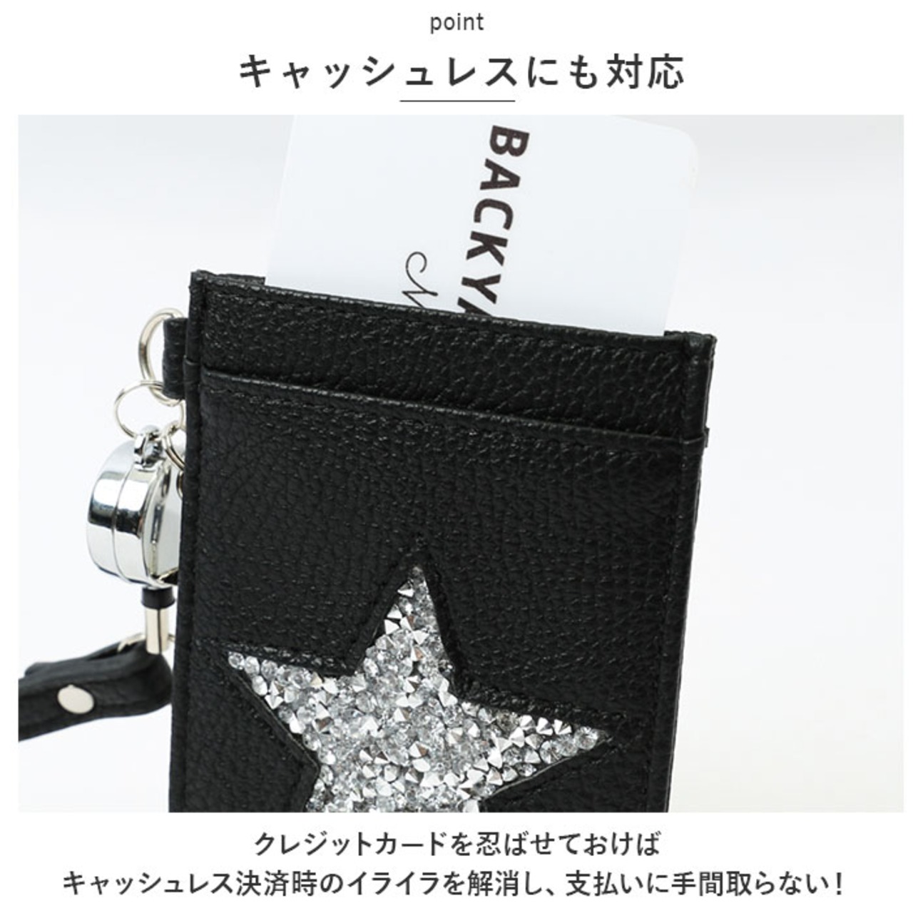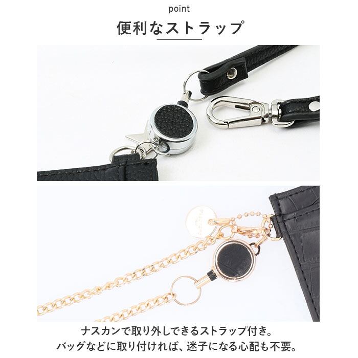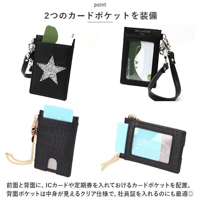 ・前面と背面に、ICカードや定期券を入れておけるカードポケットを配置。背面ポケットは中身が見えるクリア仕様で、社員証を入れるのにも最適◎