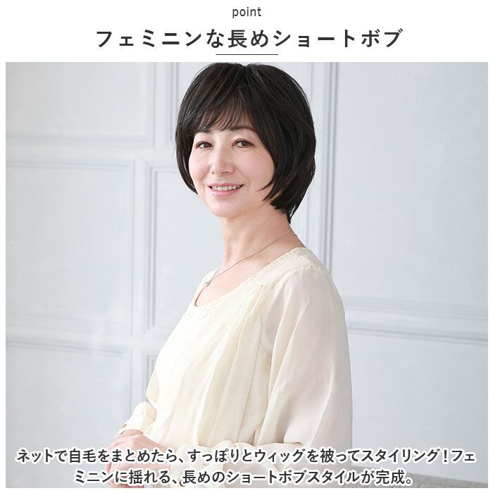 ・ネットで自毛をまとめたら、すっぽりとウィッグを被ってスタイリング!フェミニンに揺れる、長めのショートボブスタイルが完成。
