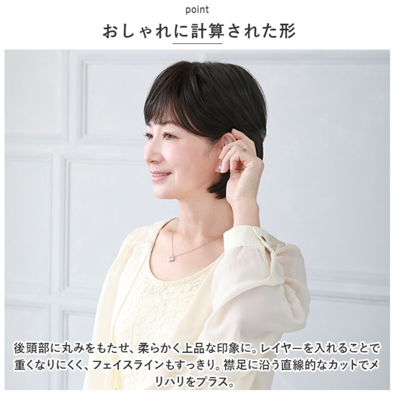 ・後頭部に丸みをもたせ、柔らかく上品な印象に。レイヤーを入れることで重くなりにくく、フェイスラインもすっきり。襟足に沿う直線的なカットでメリハリをプラス。