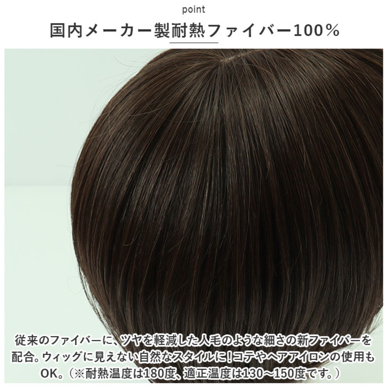 ・従来のファイバーに、ツヤを軽減した人毛のような細さの新ファイバーを配合。ウィッグに見えない自然なスタイルに!コテやヘアアイロンの使用もOK。(※耐熱温度は180度、適正温度は130~150度です。)
