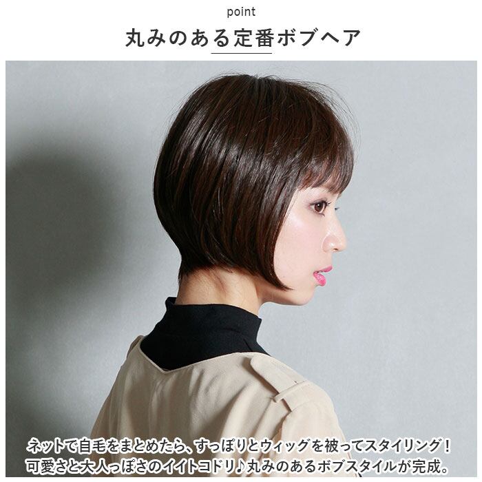 ・ネットで自毛をまとめたら、すっぽりとウィッグを被ってスタイリング!可愛さと大人っぽさのイイトコドリ♪丸みのあるボブスタイルが完成。