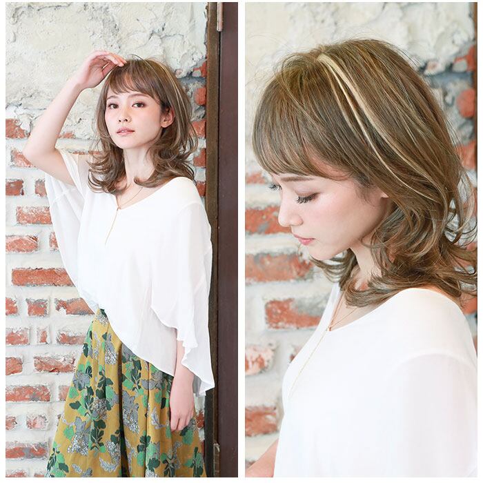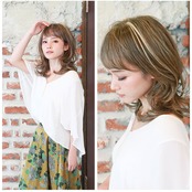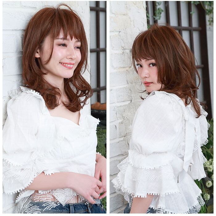 ・前髪を少なめに調整し、全体的に大きめのカールを入れた軽やかな仕上がり。毛先がランダムに散りやすく、スタイリング次第で表情がチェンジ。カジュアルな印象のヘアに。