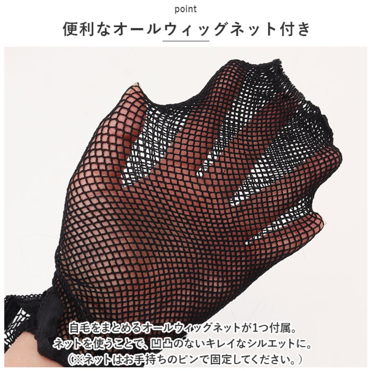 ・自毛をまとめるオールウィッグネットが1つ付属。ネットを使うことで、凹凸のないキレイなシルエットに。