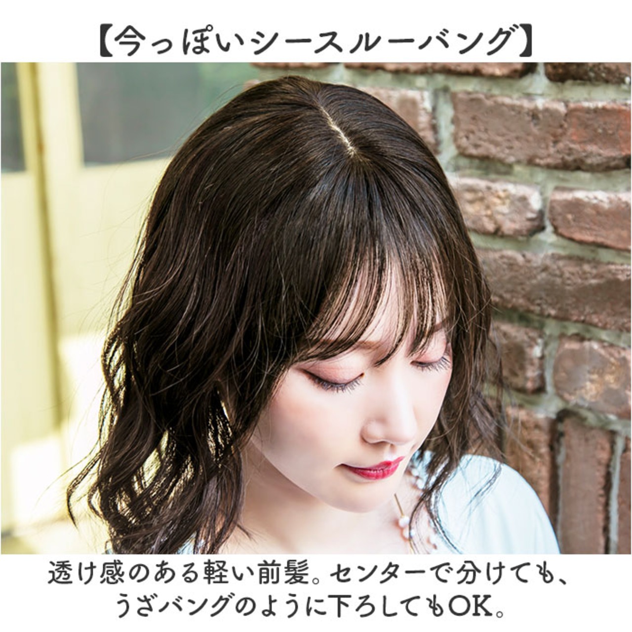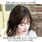 ・透け感のある軽い前髪。センターで分けても、うざバングのように下ろしてもOK。