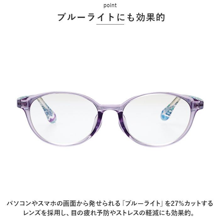 ・パソコンやスマホの画面から発せられる「ブルーライト」を27%カットするレンズを採用し、目の疲れ予防やストレスの軽減にも効果的。