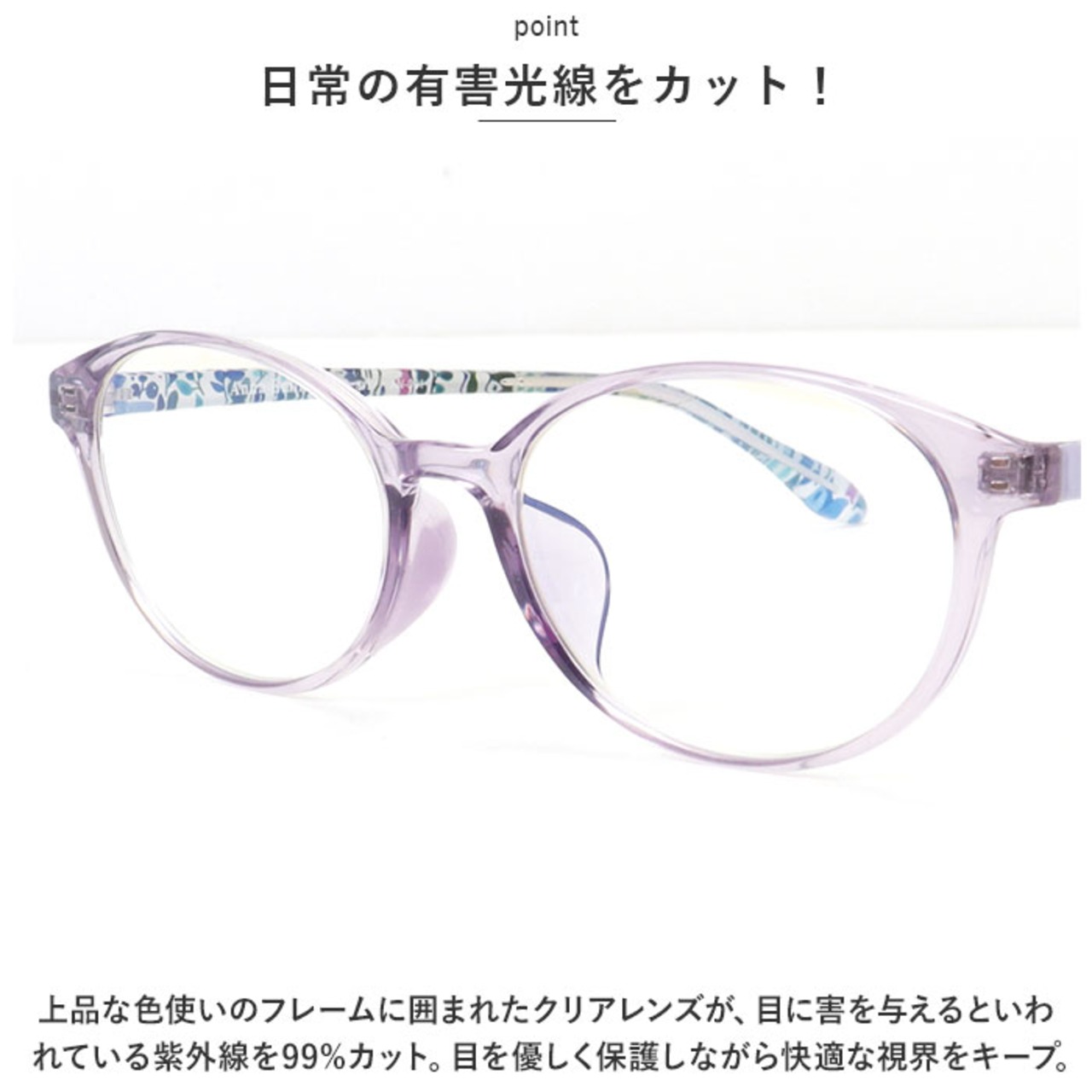 ・上品な色使いのフレームに囲まれたクリアレンズが、目に害を与えるといわれている紫外線を99%カット。目を優しく保護しながら快適な視界をキープ。
