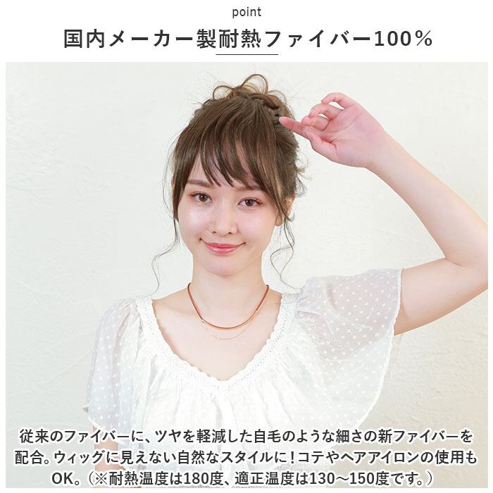 ・従来のファイバーに、ツヤを軽減した自毛のような細さの新ファイバーを配合。ウィッグに見えない自然なスタイルに!コテやヘアアイロンの使用もOK。(※耐熱温度は180度、適正温度は130~150度です。)