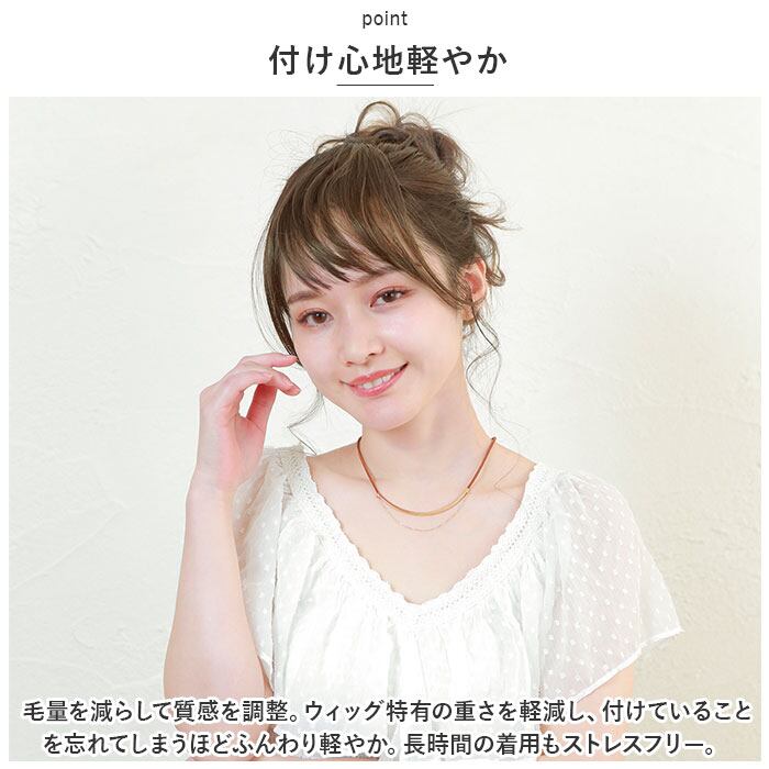 ・毛量を減らして質感を調整。ウィッグ特有の重さを軽減し、付けていることを忘れてしまうほどふんわり軽やか。長時間の着用もストレスフリー。