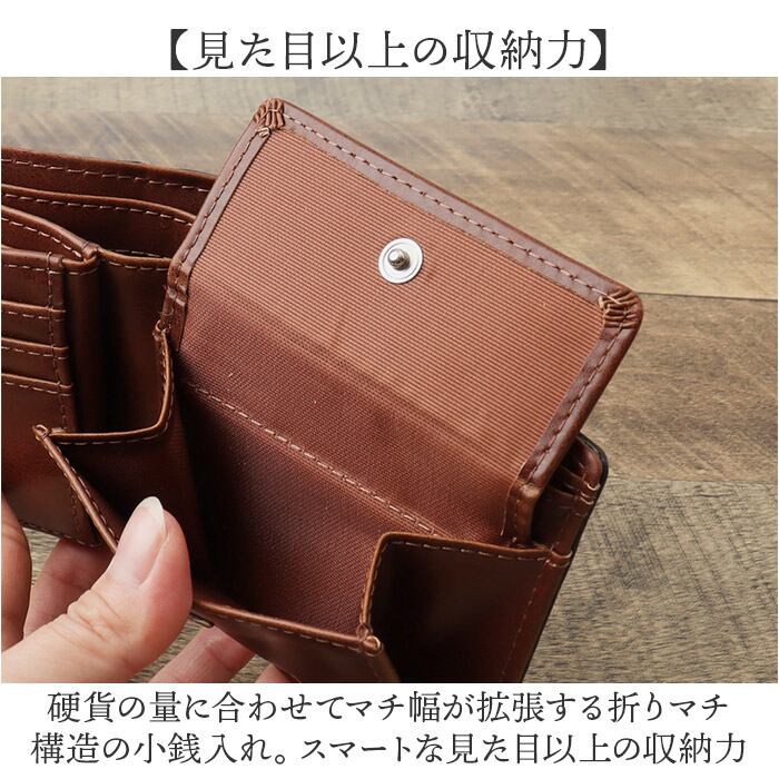・硬貨の量に合わせてマチ幅が拡張する折りマチ構造の小銭入れ。スマートな見た目以上の収納力