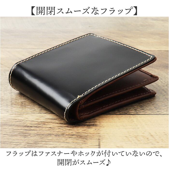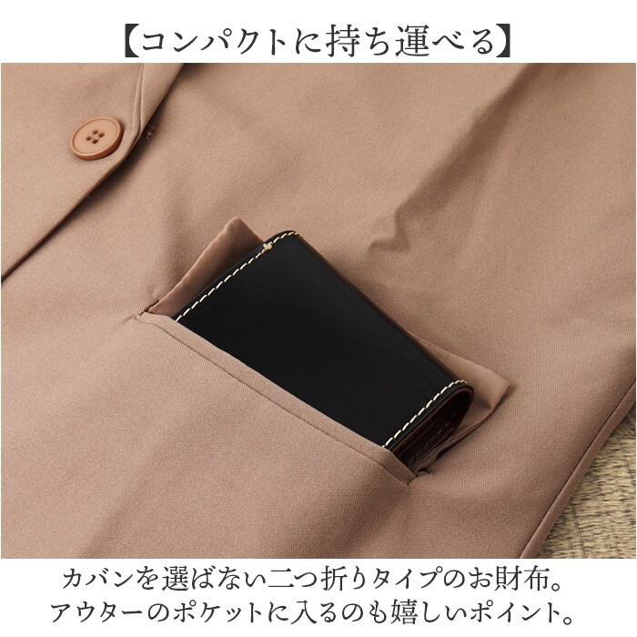 ・カバンを選ばない二つ折りタイプのお財布。アウターのポケットに入るのも嬉しいポイント。