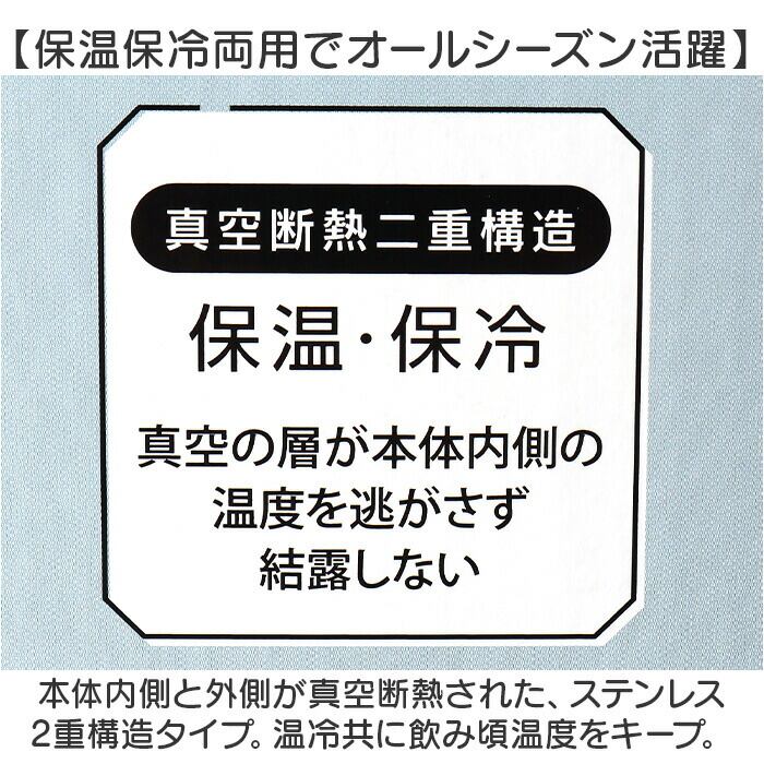 ・本体内側と外側が真空断熱された、ステンレス2重構造タイプ。温冷共に飲み頃温度をキープ。