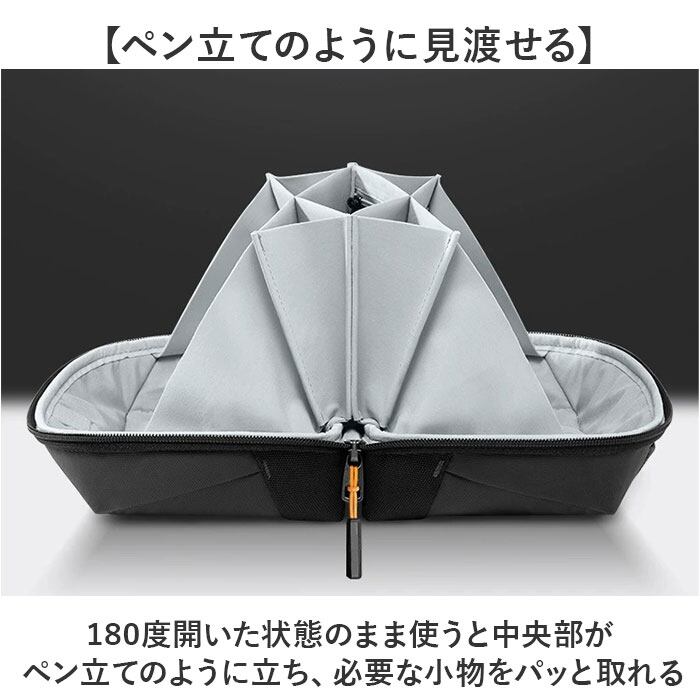 ・180度開いた状態のまま使うと中央部がペン立てのように立ち、必要な小物をパッと取れる