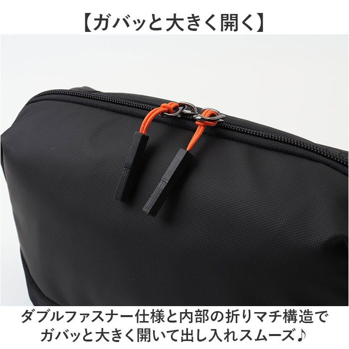 ・ダブルファスナー仕様と内部の折りマチ構造でガバッと大きく開いて出し入れスムーズ♪