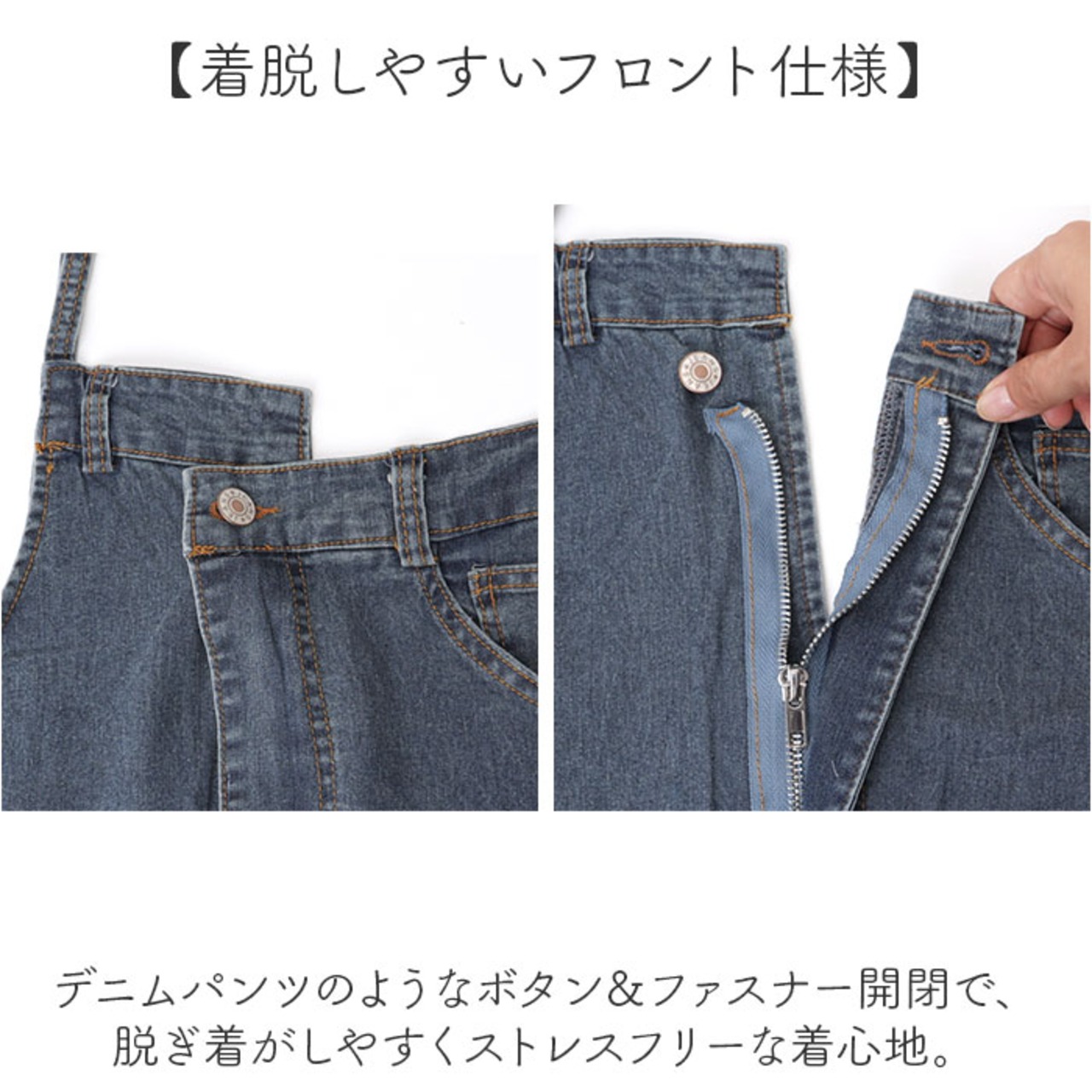・デニムパンツのようなボタン&ファスナー開閉で、脱ぎ着がしやすくストレスフリーな着心地。