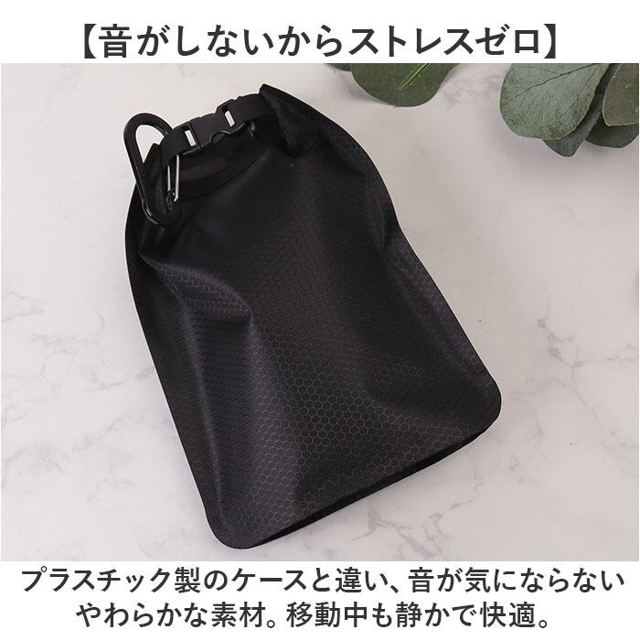 ・プラスチック製のケースと違い、音が気にならないやわらかな素材。移動中も静かで快適。