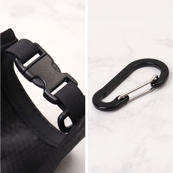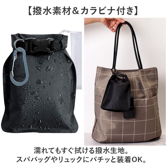 ・濡れてもすぐ拭ける撥水生地。スパバッグやリュックにパチッと装着OK。