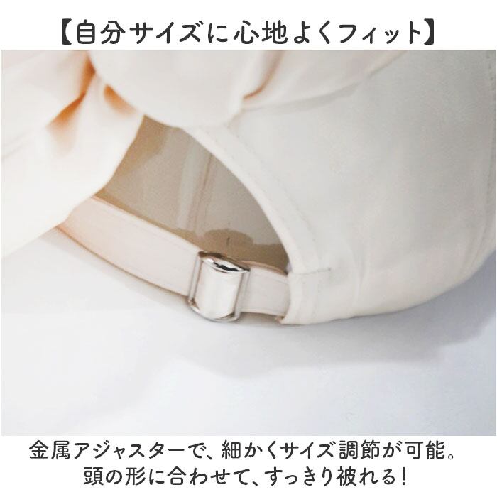 ・金属アジャスターで、細かくサイズ調節が可能。頭の形に合わせて、すっきり被れる!