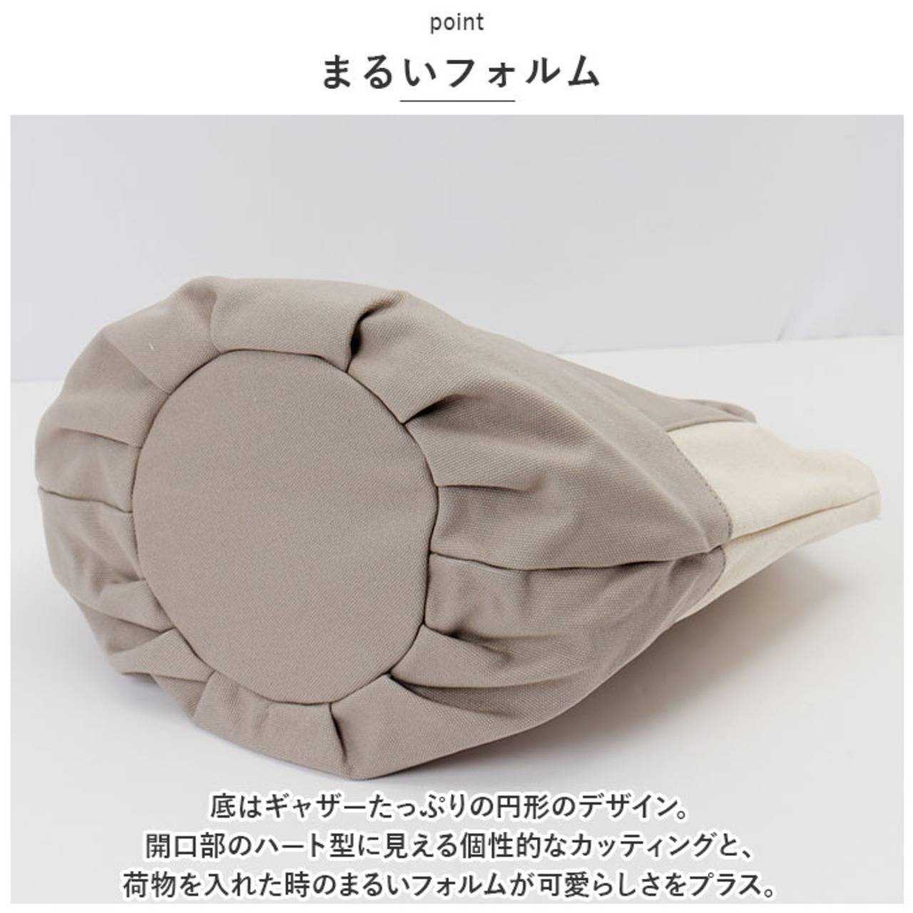 ・底はギャザーたっぷりの円形のデザイン。開口部のハート型に見える個性的なカッティングと、荷物を入れた時のまるいフォルムが可愛らしさをプラス。