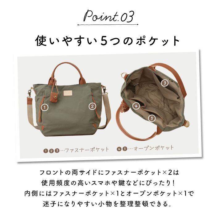 ・内側と外側に合わせて5つのポケットを配置しており、小物が迷子になりにくい!正面からはポケットが見えないという”さりげなさ”もポイント。